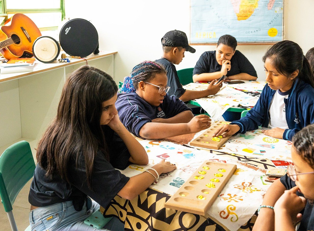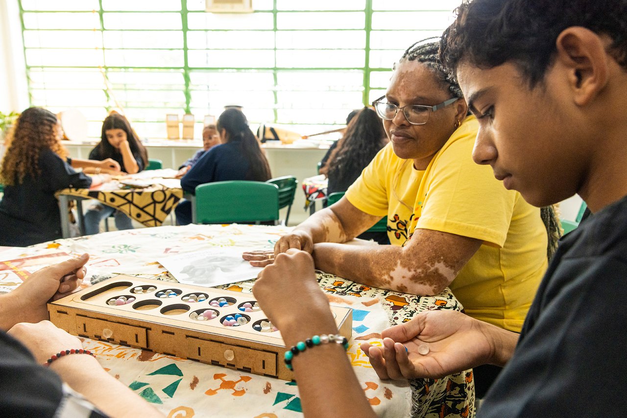 Ela conta que a escola recentemente recebeu novos docentes e que todos estão participando da formação para usar o mancala na sala de aula. O projeto já acontece na escola graças ao envolvimento de estudantes multiplicadores. Além de jogar, esses alunos fortalecem a educação antirracista ao participarem de um coletivo negro formado na escola, e do qual Elaine também participa ativamente. “Eles levam o currículo ao pé da letra, disseminando a cultura antirracista, usando o mancala, a música, a realização de debates, desfiles e várias outras atividades”, conta.