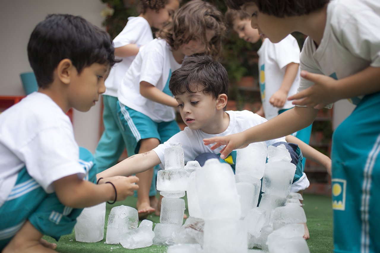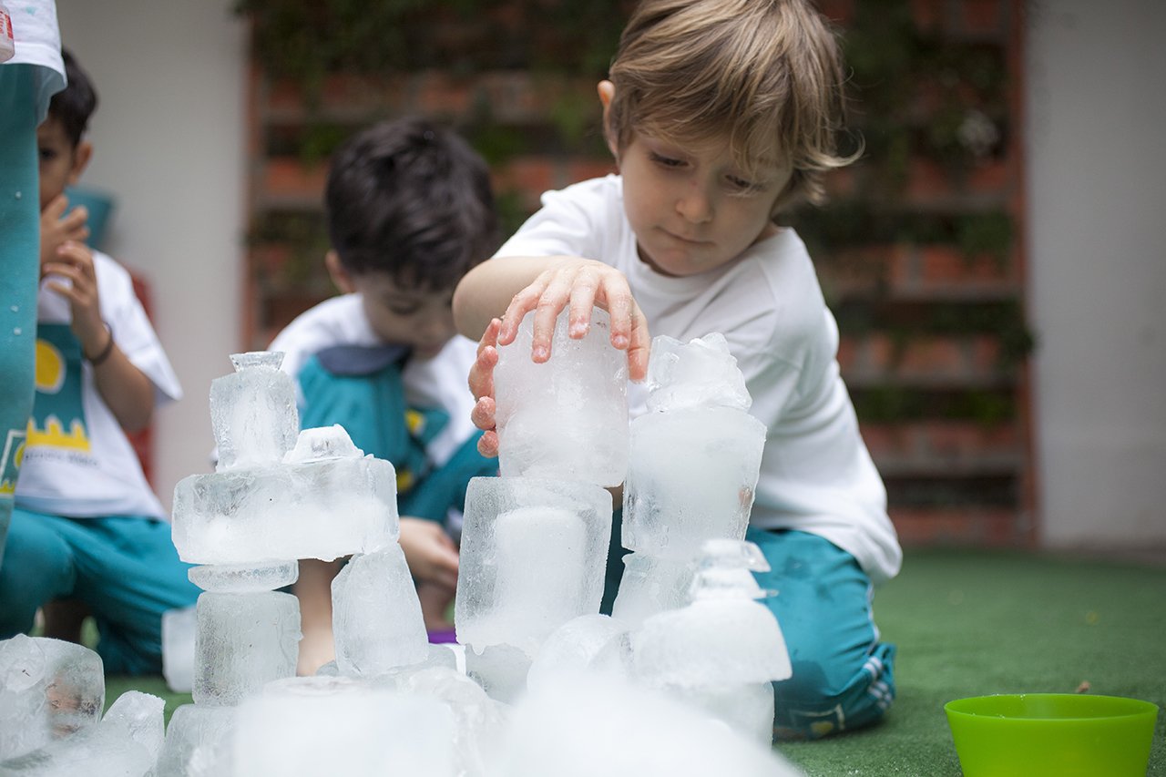 No Externato Aldeia, em Pinheiros, Brincar com Gelo é mais uma das atividades com água que estimulam a criatividade dos pequenos. “É um tema que instiga a curiosidade e as experiências empolgam, de tal forma que às vezes ficamos uma semana trabalhando em cima disso”, conta a diretora Helô Reuter. “Fabricamos juntos tijolinhos de gelo. Para isso usamos potes de margarina, garrafas de água, que depois de congelados vão servir à imaginação. Na grama, unimos os blocos de gelo com sal e construímos castelos, muralhas, as ideias vão surgindo espontaneamente.”