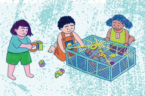 A atividade estimula, por meio da tentativa e do erro, a exploração manual de diferentes tipos de brinquedos e de objetos