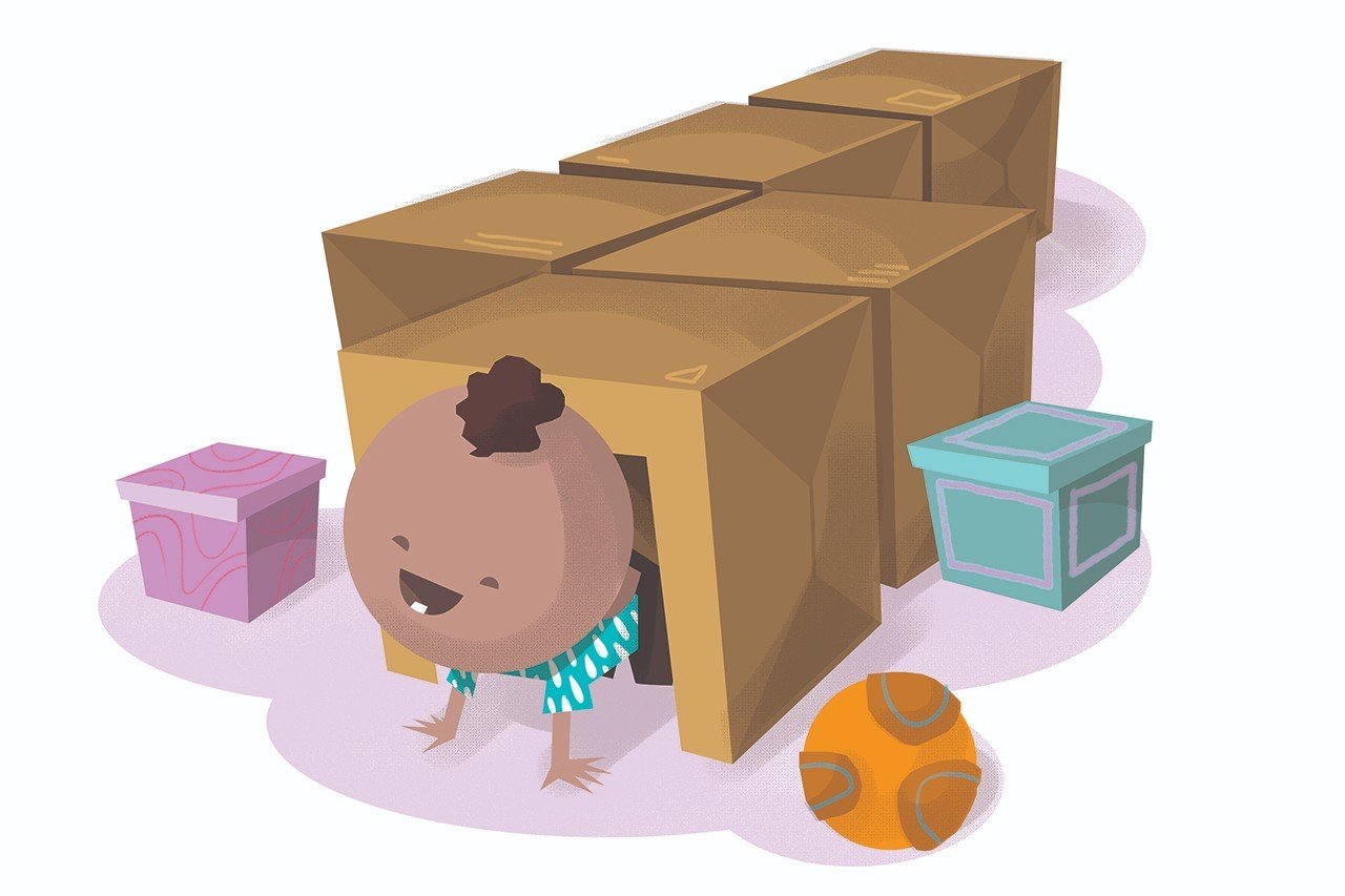 Espaço: Disponha as caixas grandes horizontalmente para formar túneis com janelas, de maneira que os bebês possam passar por dentro delas. Coloque tecidos nas entradas das caixas e por dentro das janelas. O túnel de caixas deve ficar no centro. No entorno dele, coloque os colchonetes, os tecidos e as caixas menores com as bolas. Esses itens são para que os bebês que ainda não engatinham também possam brincar de se esconder.