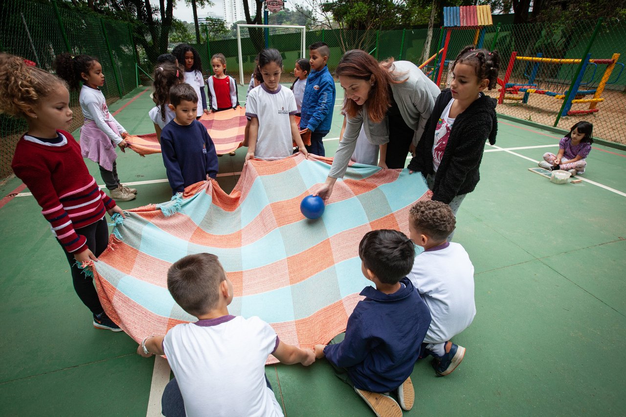 Brincar é algo natural para as crianças, desde bebês. É por meio das brincadeiras que elas exploram, conhecem e entendem o mundo. Nos jogos coletivos, as crianças aprendam a conviver, a comunicar-se com os colegas, a seguir regras, a lidar com vitórias e frustrações e a desenvolver a coordenação motora, entre outros aprendizados. A possibilidade de proporcionar essa experiência motivou Fernanda Silvia Lionese, professora na EMEI Antonio Raposo Tavares, em São Paulo, e membro do Time de Autores da NOVA ESCOLA, a apresentar para sua turma de 4 a 6 anos o volençol. Ela havia conhecido a atividade em um curso sobre jogos cooperativos e resolveu adaptá-la – a proposta original era para o Fundamental I.