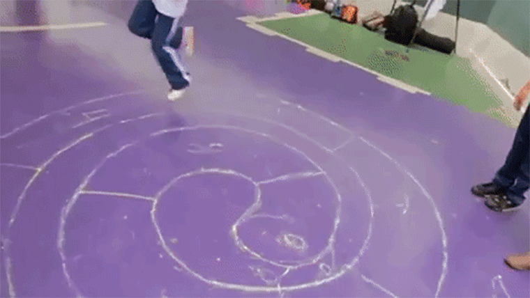 No chão, desenhe a amarelinha em formato de caracol. A criança pula em um pé só. No centro do caracol, ela coloca os dois pés no chão e volta pulando.