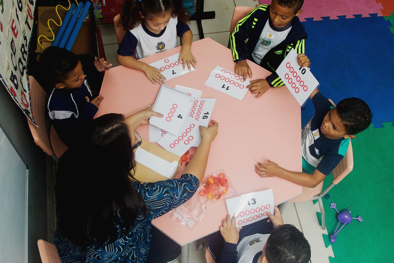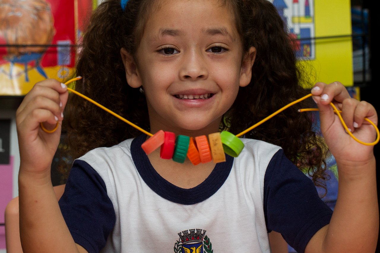 São múltiplos os caminhos para promover situações nas quais as crianças possam colocar em jogo seus saberes sobre contagem. Uma das opções da professora Rosilda Sousa Ramos Wustemberg, da EMEI Pequeno Príncipe, em Campinas (SP), é a confecção de colares com materiais simples como tampinhas coloridas de garrafas PET e barbante.