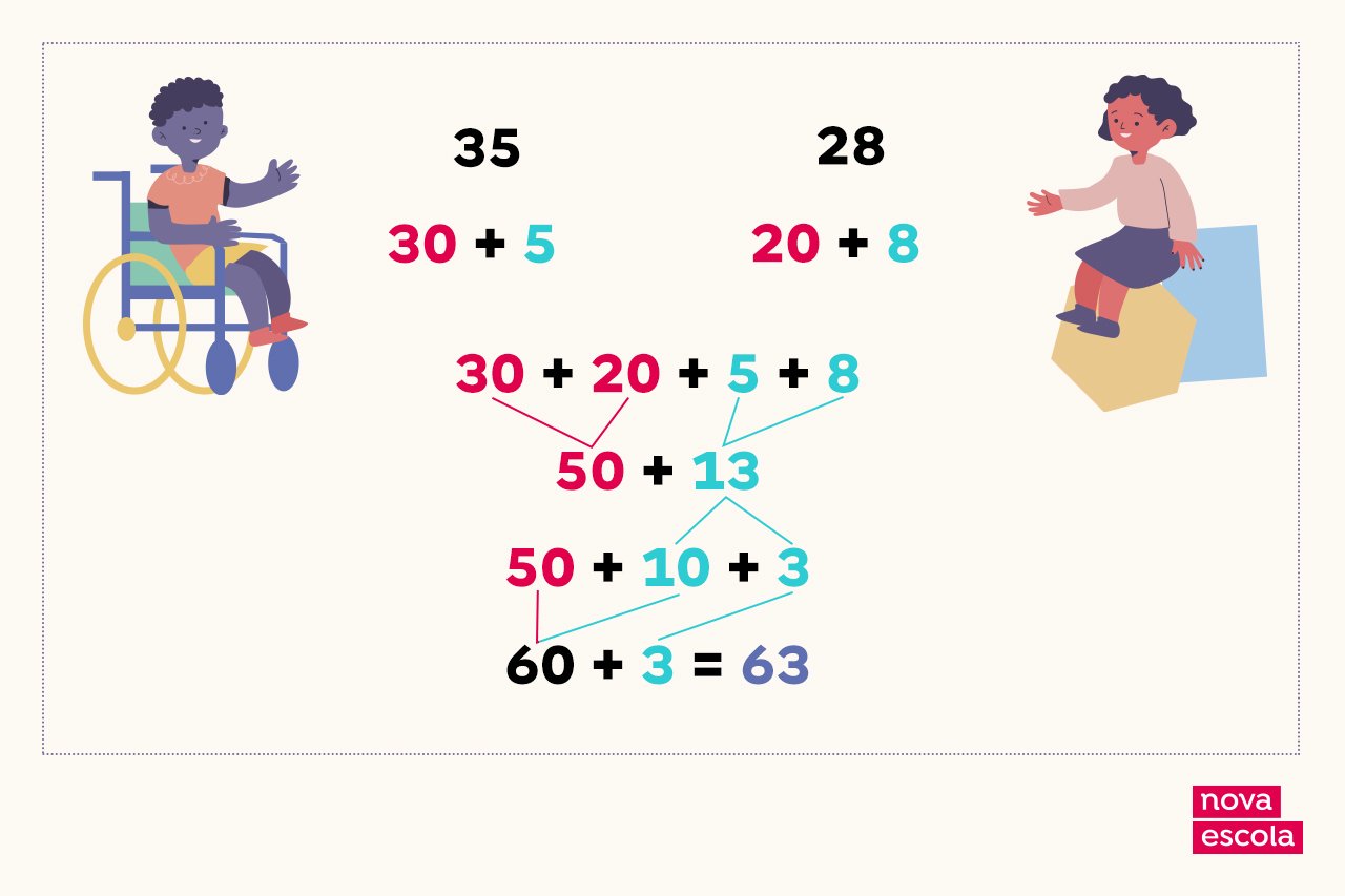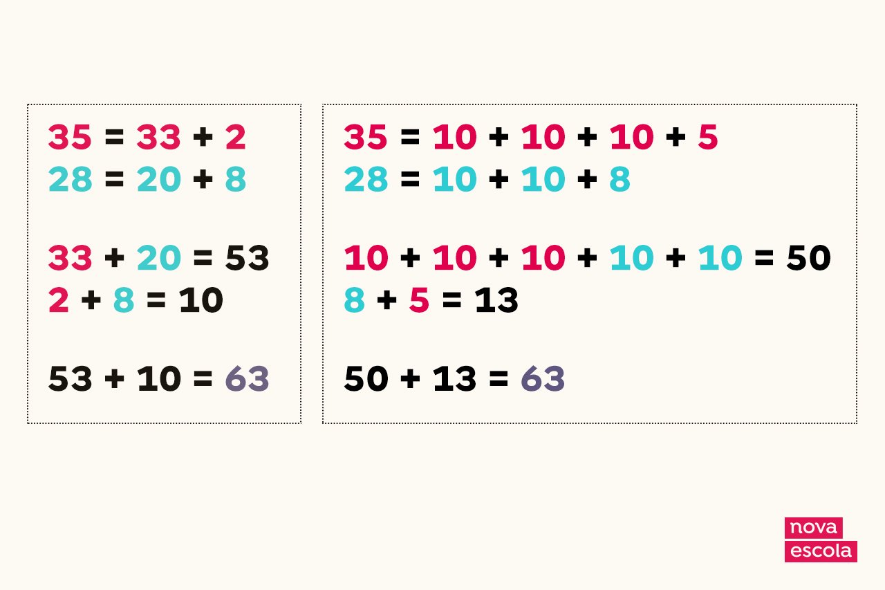 O cálculo da adição 35+28 pode ser realizado por meio de esquemas (desenhos) ou decomposição dos numerais da seguinte forma: