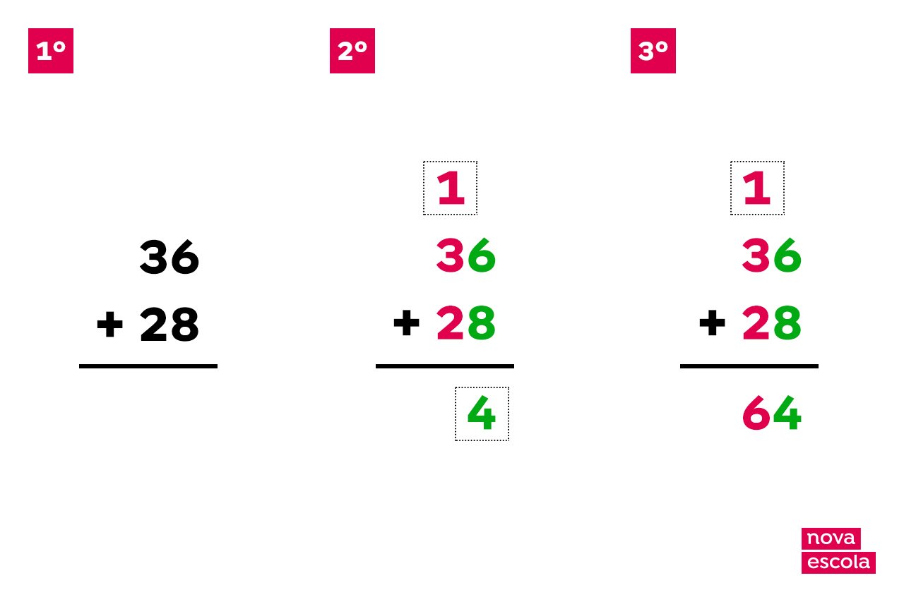 Para realizar a operação 36 + 28 utilizando o algoritmo convencional faríamos da seguinte forma: