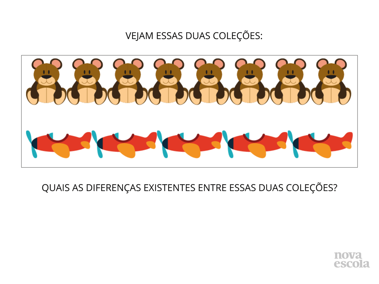 1. Envie imagens de duas coleções: Mande fotos com exemplos de duas coleções ou utilize o modelo pronto do plano de aula de NOVA ESCOLA “Representando e comparando quantidades de coleções diferentes” (veja abaixo). Cada coleção tem de possuir uma quantidade diferente de objetos. Peça que os alunos expliquem por áudio no WhatsApp ou por outro meio quais as diferenças entre as duas coleções. É importante que, além de identificarem os tipos de objetos em cada uma, eles consigam perceber a diferença de quantidade entre elas.