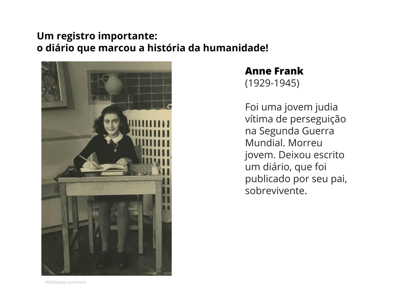 4. Conte a história de Anne Frank: Exiba a imagem de Anne Frank abaixo e conte a história da menina judia. Em seguida, proponha reflexões sobre o sofrimento de seu isolamento social devido à perseguição naxista e debata semelhanças e diferenças com a situação atual. Lembre que o diário foi importante para ela expressar seus sentimentos no contexto da Segunda Guerra Mundial. Aproveite para lembrar os estudantes que, se Anne Frank não tivesse escrito o seu diário, não poderíamos usar sua narrativa para compreender melhor um episódio histórico triste da humanidade.