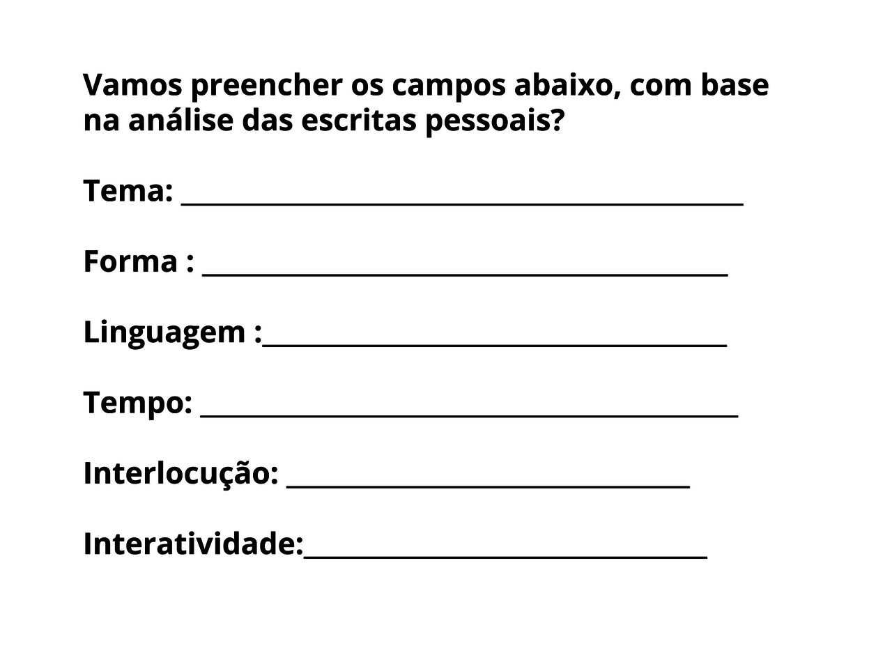 8. Preenchendo uma tabela com a turma: Diga-lhes que irão auxiliar no preenchimento da tabela do slide 6 (acesse aqui). Você será escriba digital. Utilize o cursor para completar o quadro do PowerPoint ou Google Slides, à medida que analisam as escritas pessoais presentes no slide 5, as quais eles terão em mãos. Confira na seção "desenvolvimento" do plano de aula original os tópicos que podem ser preenchidos.