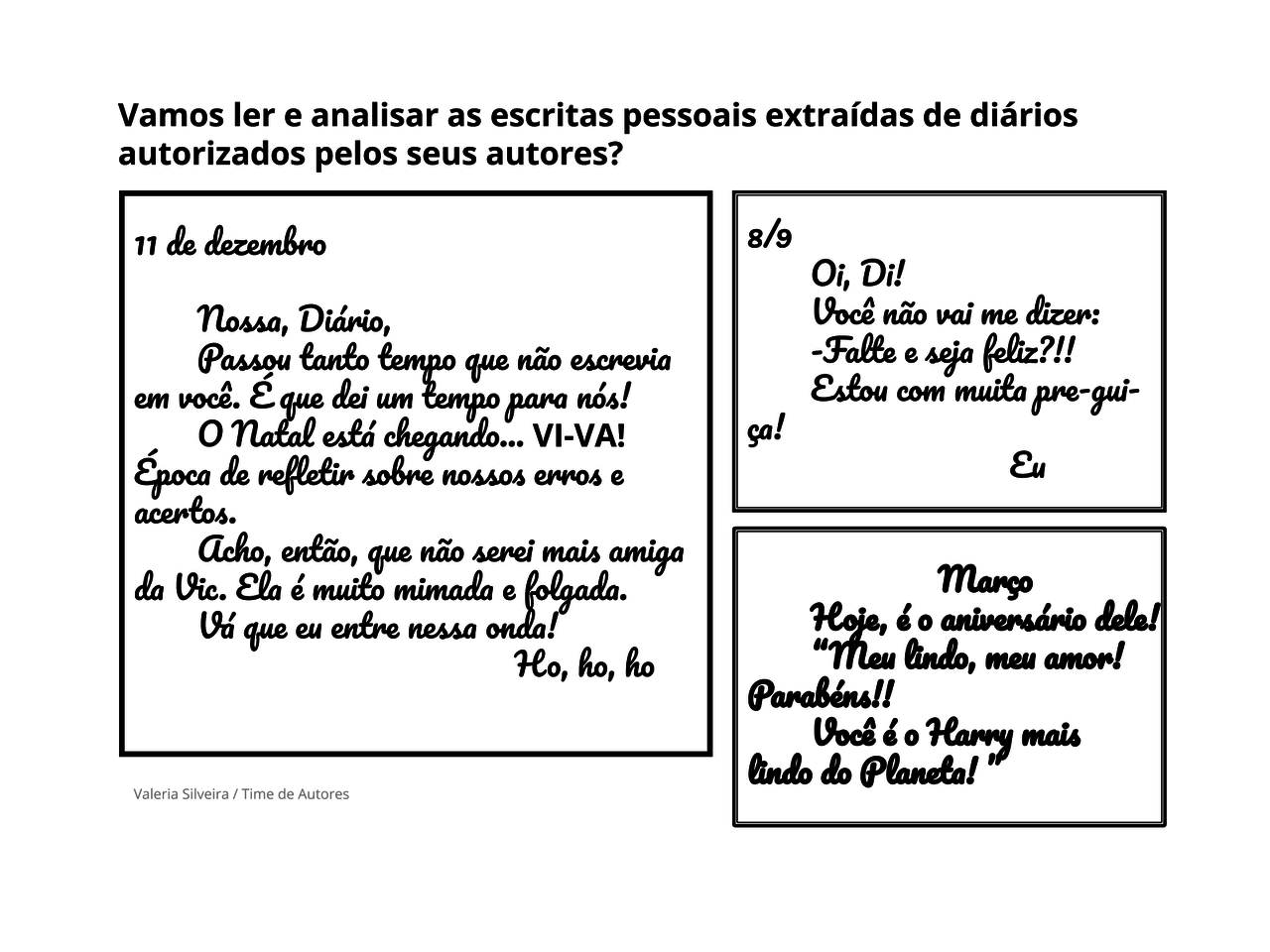 *Esta sugestão de atividade foi adaptada da sequência de 15 planos de aula sobre o gênero Diário, criados por Valéria Rodrigues da Silveira, professora-autora do Time de Autores NOVA ESCOLA, de São Paulo (SP). Para conferir a sequência na íntegra, clique aqui.