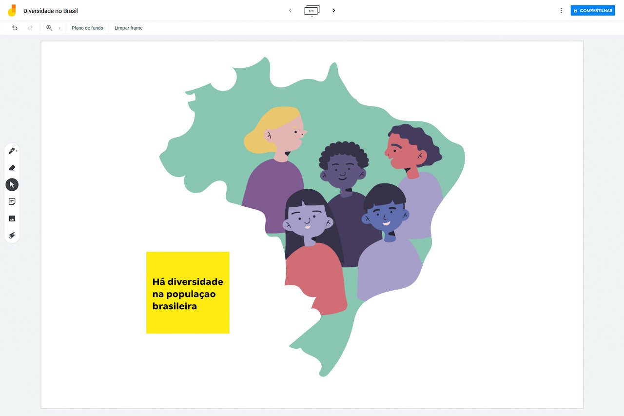 5. Utilize o Google Jamboard: É possível também trabalhar a atividade no ambiente do Google Jambord. Compartilhe a imagem a seguir em um arquivo na plataforma e peça aos alunos, individualmente, que criem notas adesivas sobre a diversidade étnico-racial brasileira representada nesta imagem. Confira, a seguir, a imagem e um modelo: