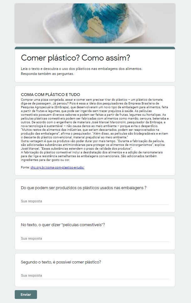 2. Recomende uma leitura em casa: Para que as crianças possam refletir e iniciar o levantamento de opções ao uso do plástico, proponha a leitura da reportagem Coma com plástico e tudo, publicada pela Revista Ciência Hoje Criança (edição de fevereiro de 2015). Depois de ler, os alunos deverão responder a três questões, que podem ser resolvidas em uma folha impressa (o arquivo pode ser baixado na lista de materiais acima) ou de maneira digital, em um formulário que pode ser construído facilmente no Formulários Google - basta reproduzir as perguntas com um campo de resposta aberto, conforme o exemplo abaixo: