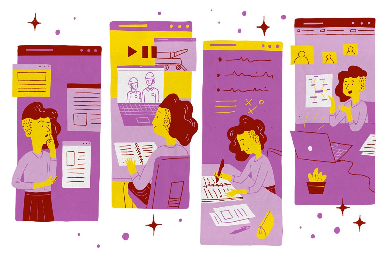 Com os grupos formados, inicia-se a fase de investigação coletiva. Nas aulas presenciais, os alunos podiam se reunir para discutir o projeto e pedir auxílio para qualquer educador, não apenas o tutor. Com o distanciamento, a interlocução, por enquanto, tem sido restrita ao professor-tutor. O debate ocorre virtualmente entre os integrantes de um mesmo grupo e também com o restante da turma. “Ainda estamos testando o debate entre grupos maiores e menores. A proposta é que cada um apresente suas hipóteses e achados e vá questionando e complementando com as contribuições dos colegas”, diz Lilian. As fontes de pesquisa são o livro didático e outros materiais de consulta indicados pelo docente.