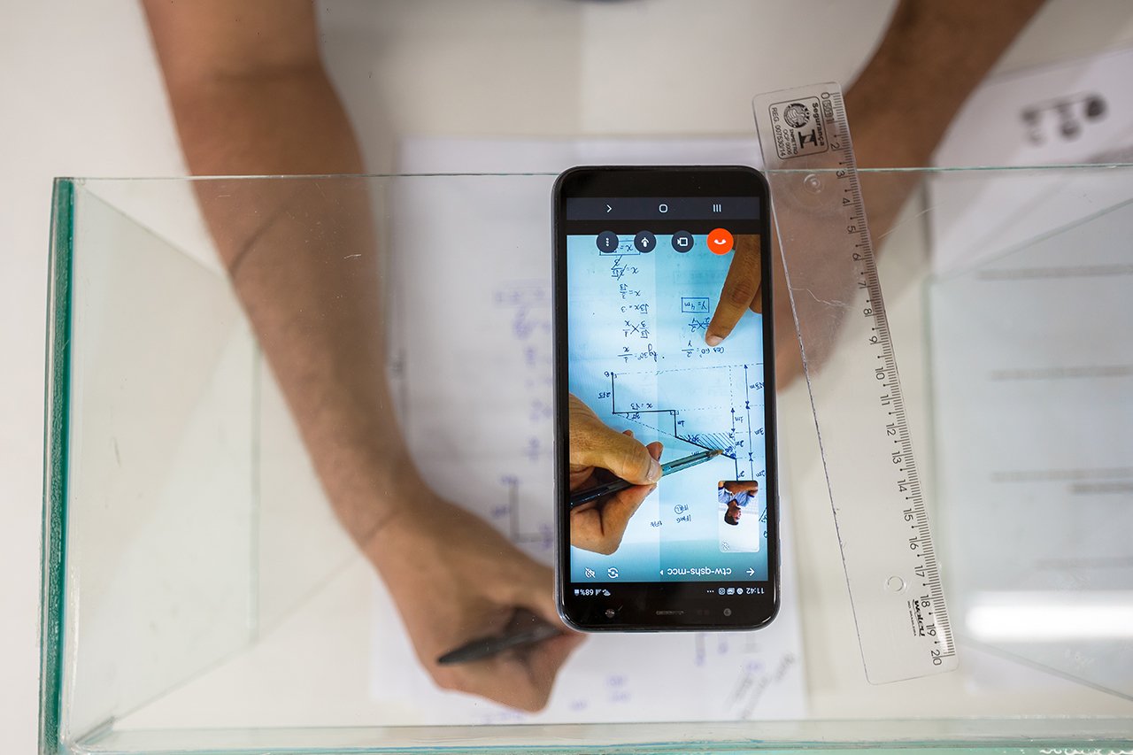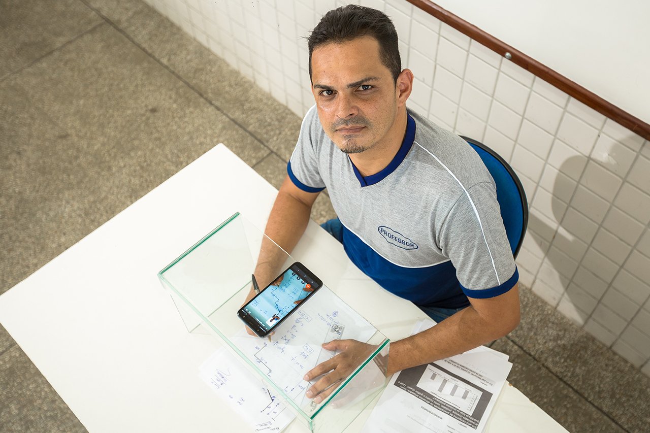 Uma das estratégias que ele utiliza é conectar-se com os estudantes em uma chamada de vídeo pelo celular. No entanto, em vez de gravar apenas ele mesmo explicando, ele apoia o celular em uma base de acrílico para conseguir capturar as explicações e o desenvolvimento dos cálculos, que são feitos no papel mesmo, sem se esquecer de envolver os alunos.