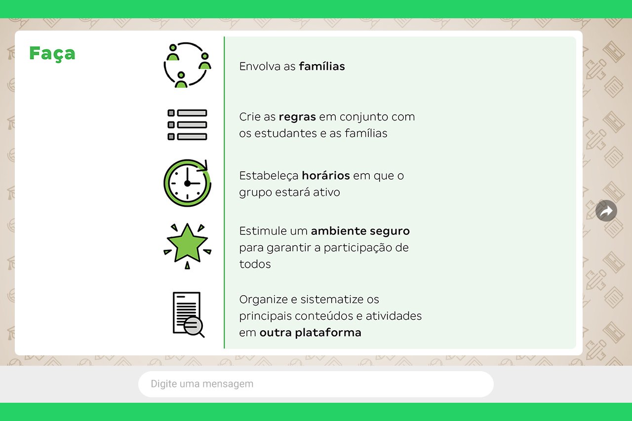 Assim como os alunos, os pais também devem participar do estabelecimento de combinados. É importante decidir quais assuntos as famílias podem tratar por essa plataforma diretamente com os professores e quais não. Uma saída é propor que ela seja utilizada apenas para combinar atendimentos – por telefone ou videochamada – entre pais, famílias e, se possível, a gestão escolar. Também vale estabelecer um prazo claro para as respostas (de um dia, por exemplo). Desse modo, é menos provável que seu WhatsApp se transforme no destino de problemas e reclamações das famílias – sem deixar de considerar os retornos delas, que podem ser importantes para ajustar o trabalho nesse momento.