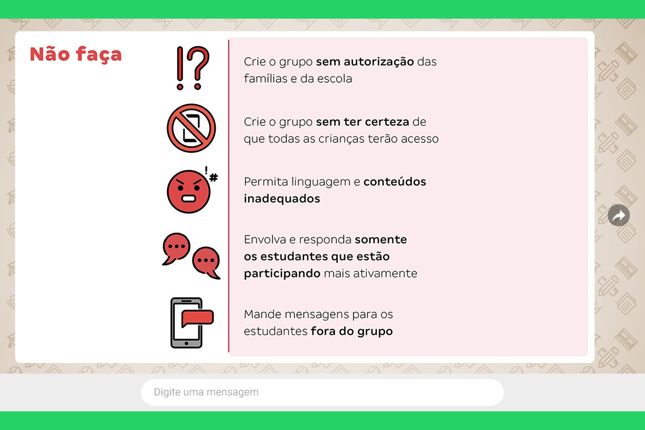 A própria experiência de usar o aplicativo de maneira orientada pode ser pedagógica. O professor Gilson conta que, quando o grupo foi criado, as crianças provocavam brincadeiras, ofensas e postavam indiscriminadamente. “Mas, com muita conversa e fazendo combinados, elAs amadureceram, e mudaram de atitude”, afirma.